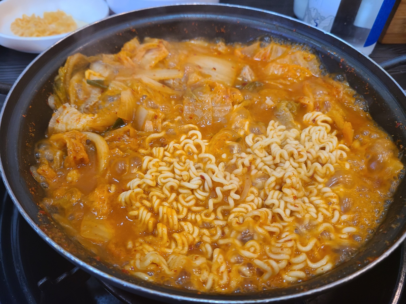 기본 메뉴이자 대표 메뉴인 통돼지김치찌개는 1인분에 9,000원으로 저렴한 편입니다. 국물맛이 칼칼하고 진해서 이렇게 추운날엔 통돼지김치찌개 강력 추천하는 메뉴입니다. 그리고 생각했던거 보다 고기가 너무 많이 들어있어서 놀랬습니다. 고기는 씹을때 너무 육질이 좋아서 그런지 맛이 좋고 부드러웠습니다. 그리고 김치찌개에 라면사리를 빼놓을수 없을듯 합니다. 김치찌개를 주문하면서 라면사리도 꼭 추가해서 초반에 라면사리를 넣어서 같이 익히다가 라면이 익으면 먼저 먹고 김치찌개와 밥을 드시면 됩니다.