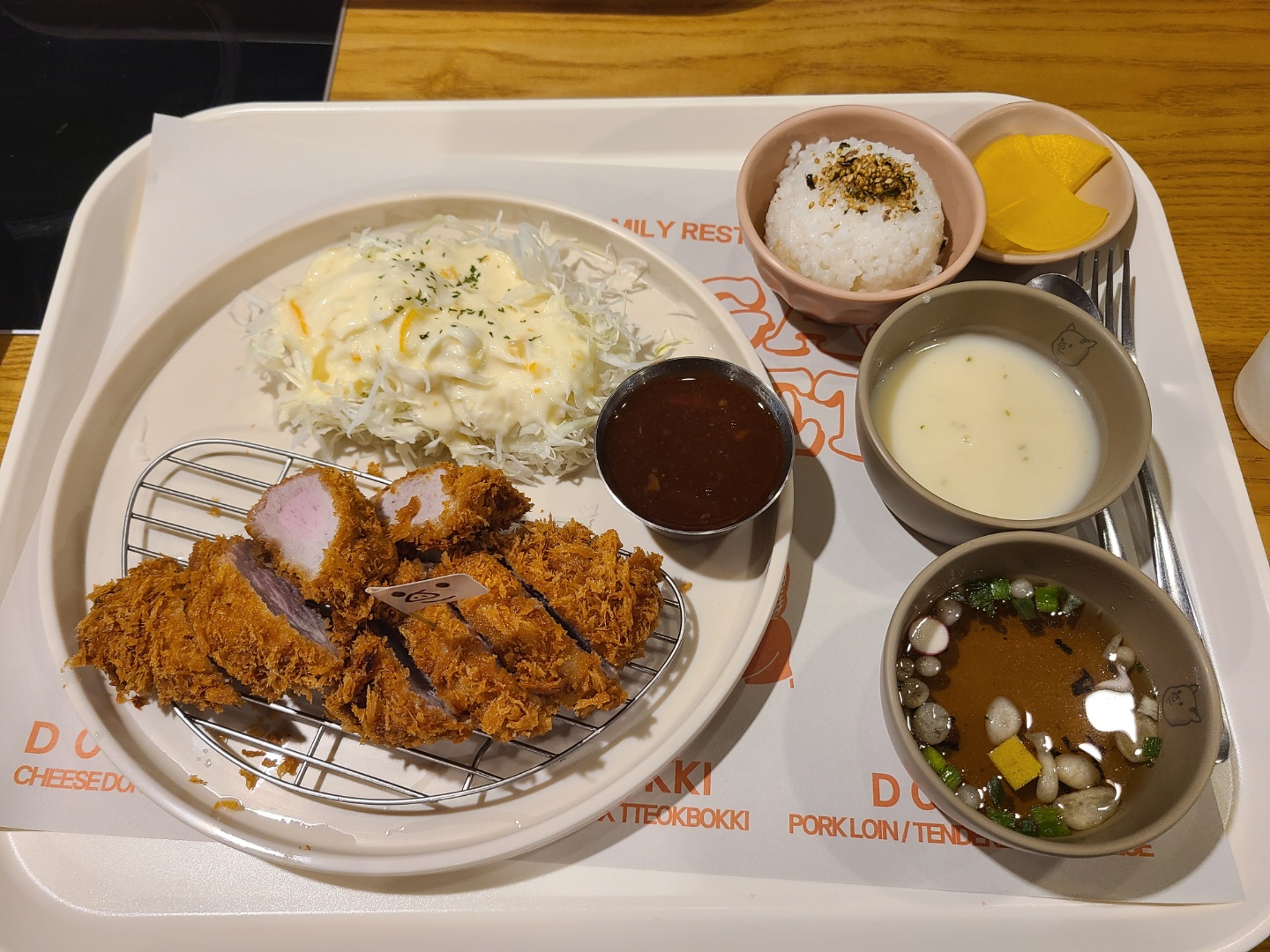 부드러운 안심 정식을 주문하면 위 사진과 같이 부드러운 수프와 밥, 국물, 단무지, 샐러드가 함께 나옵니다. 식전에 부드러운 스프로 간단하게 목을 풀고, 새초롬한 샐러드와 안심 돈까스를 입에 넣으면 입안에서 조화롭게 녹습니다. 수프는 리필이 된다고 했지만 따로 리필은 하지 않았습니다. 수프보다 돈까스 육질을 빨리 맛보고 싶었기 때문입니다. 나 포함 3명이 갔는데 주문은 전부 같은 부드러운 안심 정식으로만 주문해서 다른 메뉴 사진은 볼 수가 없습니다. 이곳 돈까스상회에는 돈떡끼와 돈스타라는 메뉴가 있는데 돈떡끼는 치즈돈까스와 떡볶이의 조합메뉴를 맛볼 수 있고 돈스타는 치즈돈까스와 파스타의 조합메뉴를 맛볼 수 있습니다. 다음에 가족들과 같이 가면 이런 조합도 아주 좋을 거 같습니다. 치즈돈까스가 떡볶이와 파스타와의 조합이 좋다는 내용을 여러 블로그에서 접할 수 있었고 다음에 가족끼리 이곳에 오게 되면 돈떡끼와 돈스타 메뉴도 꼭 주문해서 먹어봐야겠다는 생각을 했습니다.