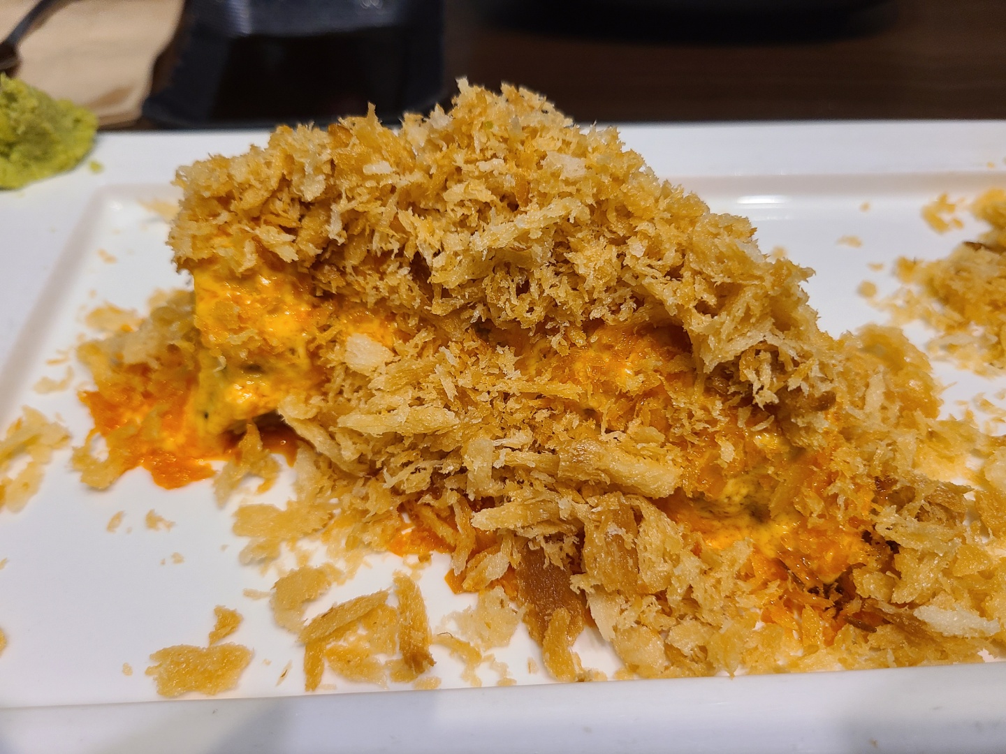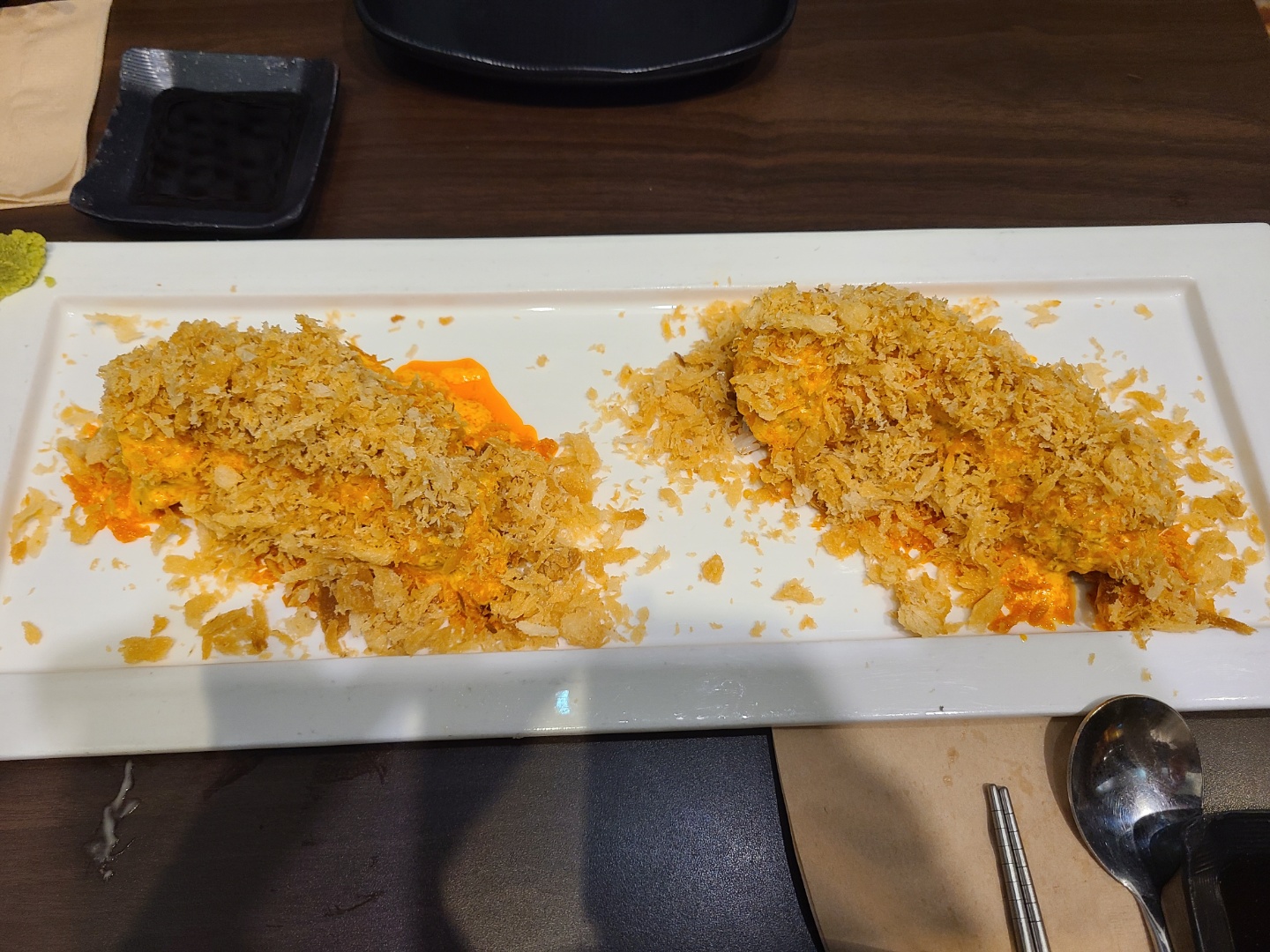 우선 다이나마이트다이너마이트 롤입니다. 말 그대로 폭탄 두덩이 올려놓은 거처럼 생겼는데 정말 맛있습니다. 소스에 살짝 찍어서 먹으면 살짝 매콤하면서 부드러워서 입안에 착 감기는 맛이 일품입니다. 입안에서 다이너마이트가 탁 터지는 느낌이라 이름도 다이너마이트 롤이라고 지은 거 같았습니다.
