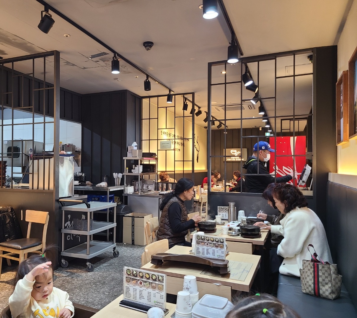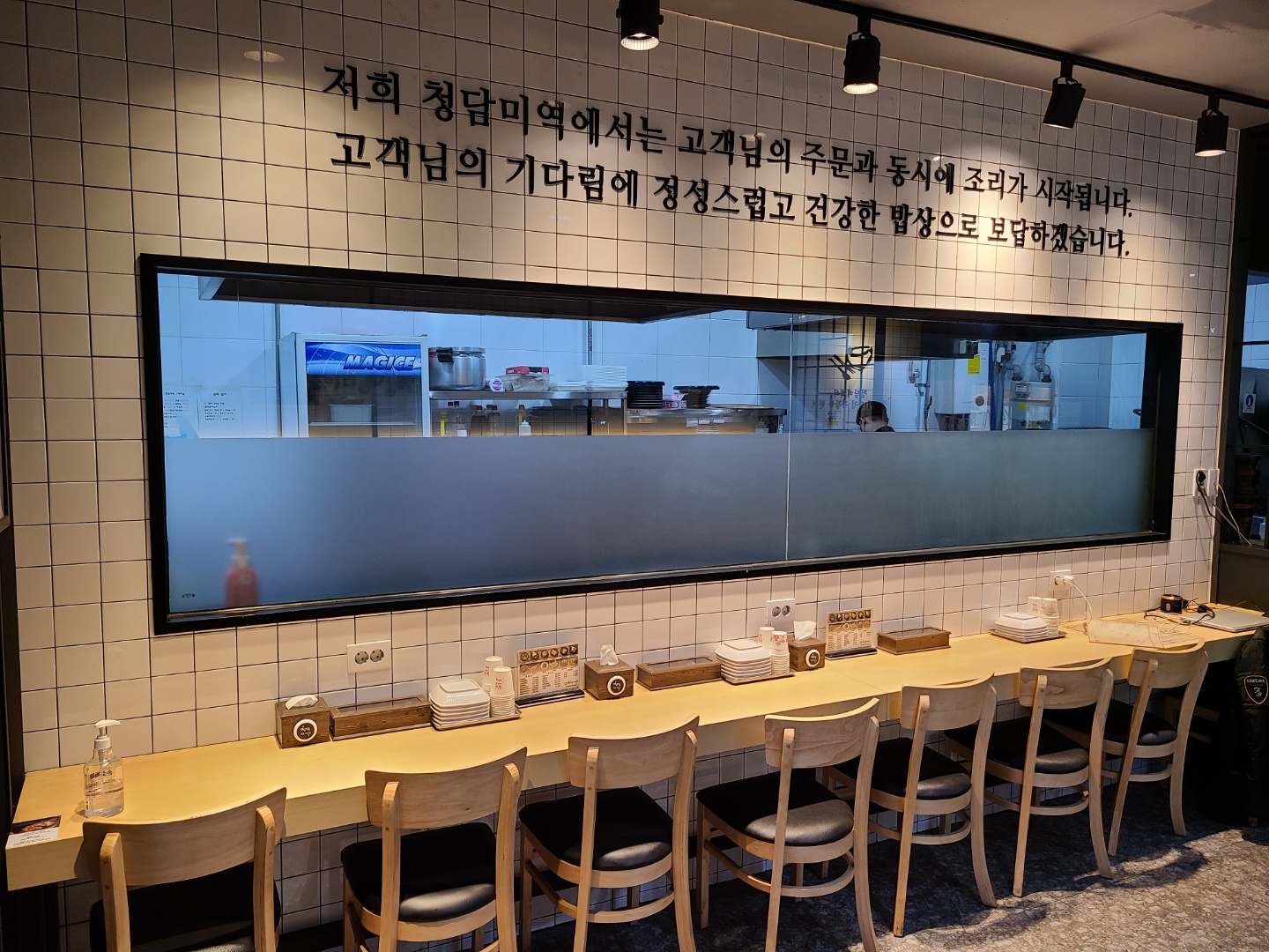 청담미역 안으로 들어서면 주방이 절반 정도 보이는 통창이 있습니다. 주방을 공개한다는 것은 대단한 자신감이 아닐까 생각이 들었습니다. 그리고 식사시간이 지나서 그런지 자리가 넉넉해서 안쪽으로 아기의자를 놓아서 불편하지 않는 자리에 앉았습니다. 주방이나 홀 모두 깔끔하고 직원들도 모두 친절해서 좋았습니다. 애들 때문에 어딜 가나 늘 민폐라 걱정이었는데 직원분들이 전혀 내색하지 않고 오히려 밝은 미소로 친절하게 서빙해주셔서 아이들도 편하게 먹을 수 있어 오히려 감사하고 미안했습니다.