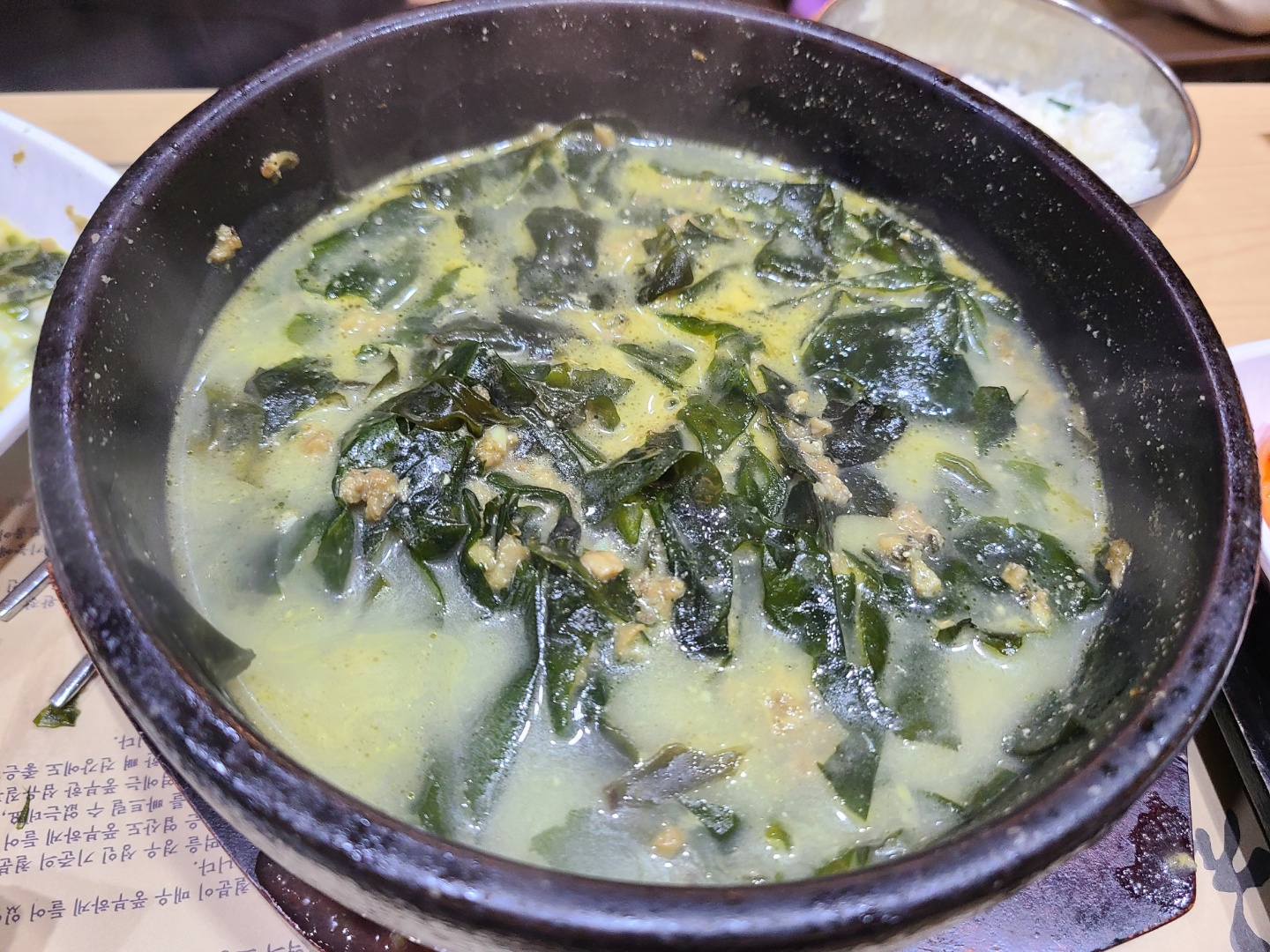 식사시간이 많이 지나서 아이들이 배고파 찡얼대서 얼른 먹이고 나갈 생각으로 기본인 조개미역국 2개, 직화불고기(직원분이 맵지 않아서 애들 먹이기 좋을 거라고 하더라고요) 1개 주문했습니다. 처음엔 기본 미역국이 1만 원이면 비싼 편인 건가 하고 생각했는데 실물을 보고 나서 생각이 바뀌었습니다. 생각보다 양이 엄청 많습니다.