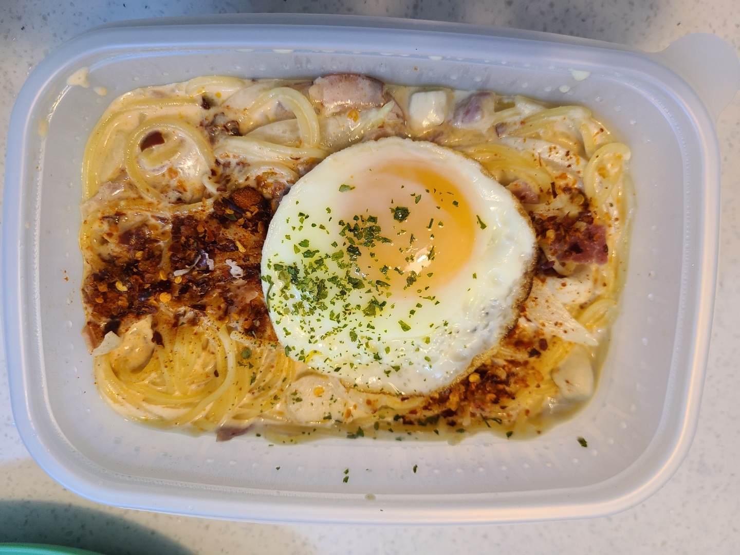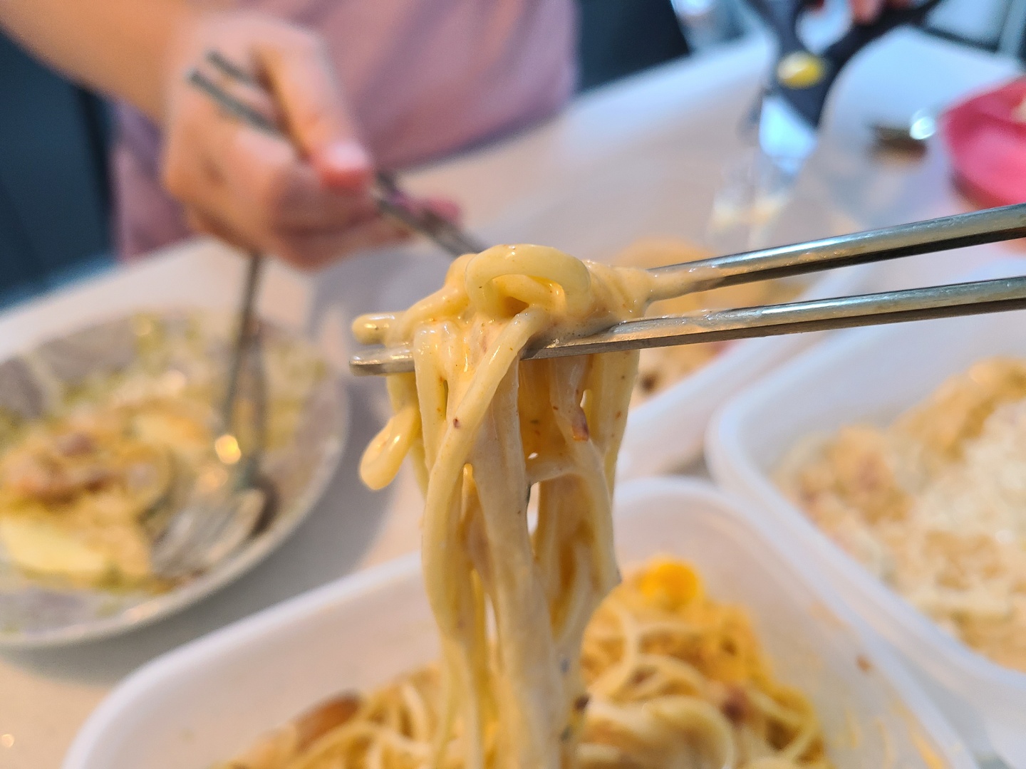 요건 애들이 좋아하는 베이컨 까르보나라 파스타입니다. 이것도 가격은 9,900원으로 저렴하고 아주 부드럽고 맛있습니다. 까르보나라 파스타도 맛을 선택할 수 있는데 기본, 매콤 1단계, 매콤 2단계 이렇게 3종류입니다. 저희는 어린애들 먹일 거라 기본 맛으로 선택했습니다. 얼마나 맛있는지 짜장면 먹는 것처럼 입 주변에 하얀색 크림소스를 잔뜩 묻히면서 먹는 모습이 너무 귀여웠습니다.